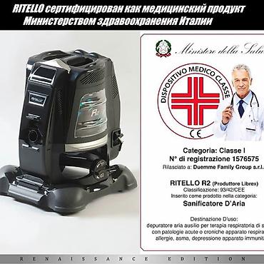 - Сертификация: указан как медицинский продукт класса I (Италия) в категории «Sanificatore d’Aria» (санитайзер/очиститель воздуха).