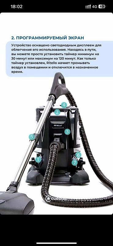 - Промывка и санация воздуха: режим самостоятельной работы без щётки — прибор гоняет воздух через водяной бак, снижая запылённость и запахи.