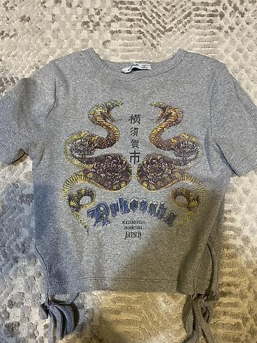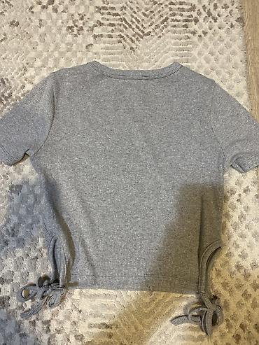 Серая укороченная трикотажная футболка с принтом и завязками по бокам.(топик)
