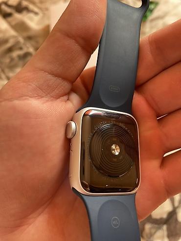Смарт‑часы Apple Watch (серия SE/Series с корпусом 40/41 мм — алюминий, цвет серебристый) с синим спортивным ремешком M/L.