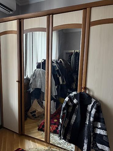 - Шкаф распашной 5‑дверный с двумя зеркальными створками. Комбинация светлых фасадов и ореховых рамок, удобные вертикальные ручки. Внутри — секции для вешалок и полки.
