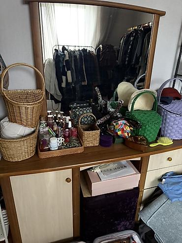 - Туалетный стол/комод с большим настенным зеркалом. Две закрытые секции по бокам, центральная открытая ниша, выдвижные ящики; широкая столешница.