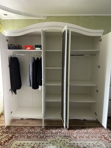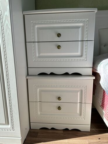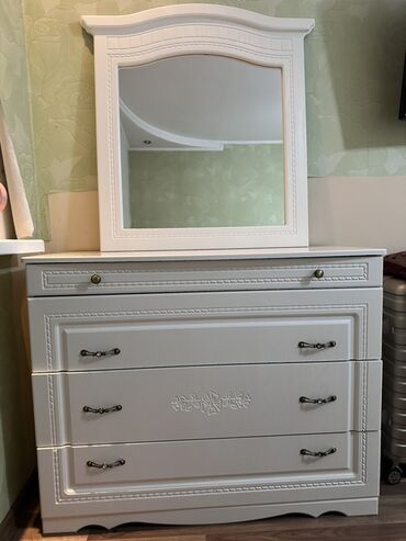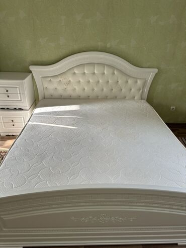 Продается Спальный гарнитур белого цвета, без матраса состоящий из двуспальной кровати с мягким изголовьем, 1.8\2м вместительного шкафа и двух прикроватных тумб. Единственное Изголовье кровати с царапинками. В целом состояние хорошое Шкаф имеет три зеркальные дверцы в центральной части и две глухие по бокам, украшенные резьбой, что обеспечивает удобное хранение одежды и визуально расширяет пространство. Прикроватные тумбы с двумя выдвижными ящиками каждая дополняют комплект, предлагая место для хранения мелочей. Гарнитур выполнен в классическом стиле, подойдет для оформления спальни.