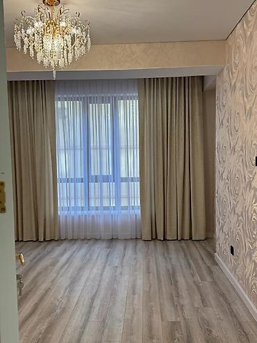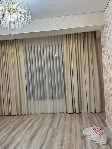 - Две светлые комнаты с панорамными шторами: плотные бежевые портьеры и тюль, современные трековые светильники и хрустальные люстры.