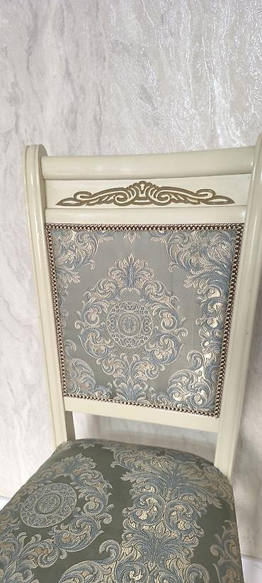 - Обивка сиденья и спинки: жаккард с богатым барочным орнаментом; оттенки серо-голубого с перламутровым отливом.
