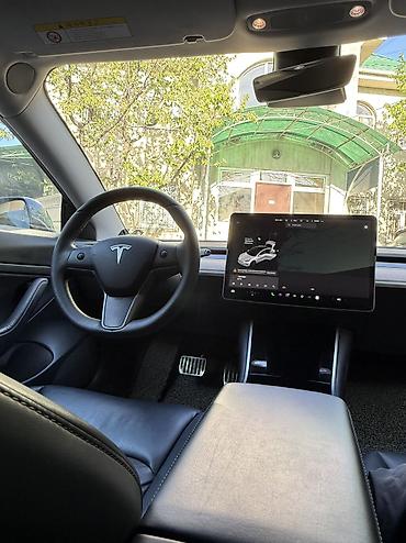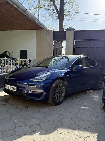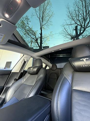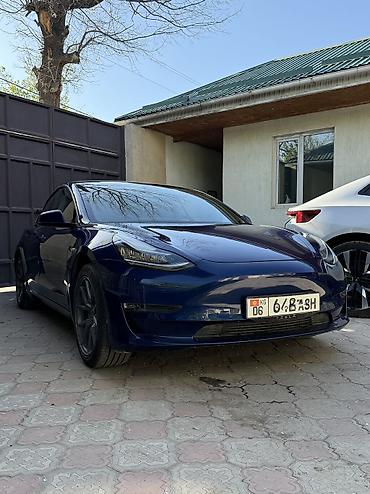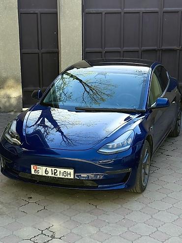 Электромобиль Tesla Model 3 (судя по интерьеру и багажникам) в синем цвете. Ключевые особенности: - Полностью электрический седан с центральным 15-дюймовым сенсорным дисплеем: навигация, мультимед...