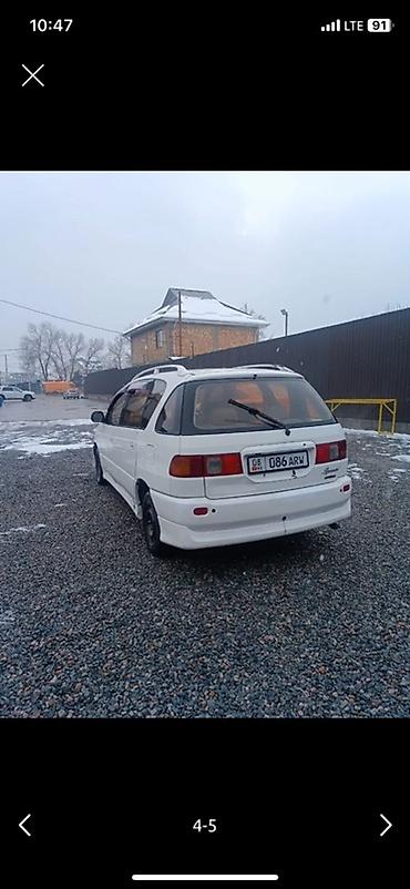 Toyota Ipsum (Picnic) — 7‑местный компактвэн, правый руль. Белый цвет кузова, аэродинамический обвес, рейлинги на крыше. Передний бампер с противотуманными фарами, мухобойка на капоте. Задняя двери багажника с дворником, широкие задние фонари. Тонированные стекла, черные стальные диски. Номерной знак формата KG. Просторный салон с большим багажником, трансформация кресел для перевозки пассажиров и грузов. Отличный семейный автомобиль для города и поездок за город.