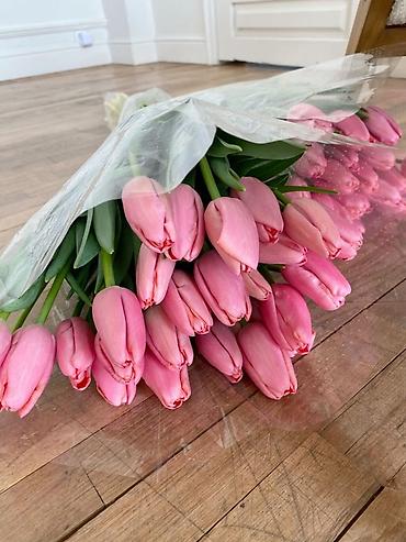 - Ассортимент: розовые, белые, двухцветные (красно‑жёлтые, малиново‑белые) тюльпаны с длинными упругими стеблями и плотными бутонами.