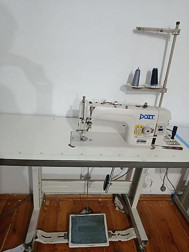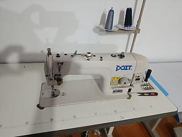 - Прямострочная промышленная швейная машина DoIT (одноигольная, челночный стежок) на столе с регулируемой стойкой для катушек, ножным приводом и линейкой‑разметкой на столешнице. На корпусе — регуляторы натяжения, позиционер/датчик, смотчик шпулек, встроенная маслованная система. В комплекте видны держатель игл/лапок и распарыватель.