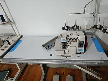 - Оверлок JACK (многониточный) на отдельном промышленном столе с ножным приводом, электронной панелью управления, блоком дифференциальной подачи, верхним ножом, стойкой на 5 катушек и линейкой‑разметкой по кромке столешницы.