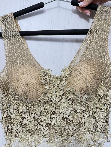 - Лиф: полупрозрачная сетка цвета шампань с фигурной отделкой; объёмная цветочная вышивка с бисером и пайетками, декоративные камни; широкие бретели; сзади скрытая молния.