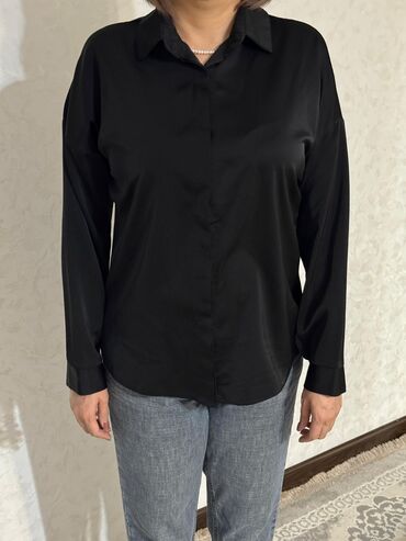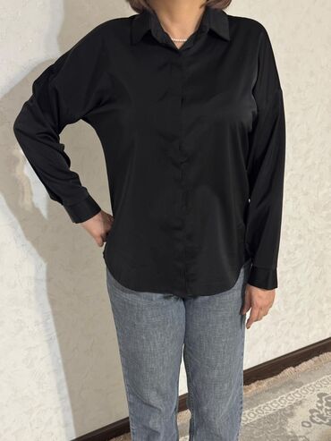 - Черная рубашка из гладкой ткани: скрытая планка (пуговицы прикрыты), мягкий драпирующийся материал с легким сатиновым блеском, удлиненный закругленный низ, манжеты на пуговицах.