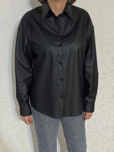 - Черная рубашка из материала под кожу: матовый легкий кожзам, прямая линия плеч с небольшим спущенным эффектом, манжеты на пуговицах, закругленный низ.