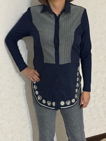 - Темно-синяя рубашка с декором: контрастные вставки «гусиная лапка» спереди, декоративная вышивка/аппликации по бокам и по краю низа, классическая планка на пуговицах, удлиненный силуэт, закругленный подол.