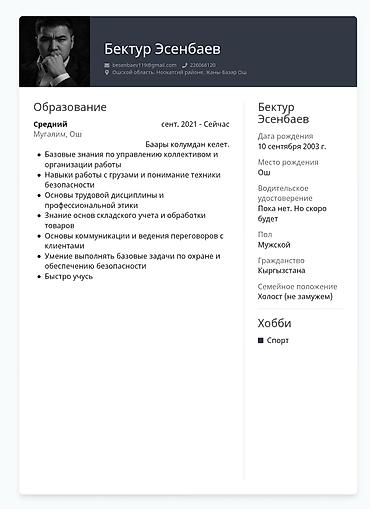 Профиль: - Имя: Бектур Эсенбаев - Образование: среднее (обучение с
