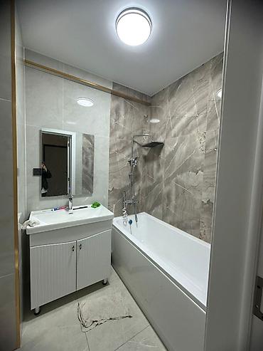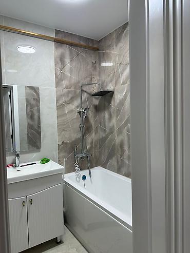 - Компактная тумба с умывальником и смесителем, зеркало с подсветкой.
