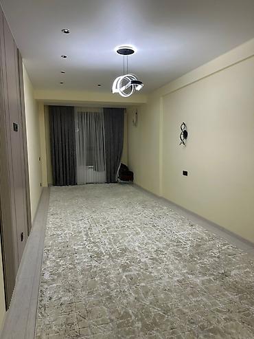 - Просторная комната вытянутой формы с натяжным потолком, трековыми и точечными светильниками, декоративной подвесной люстрой.