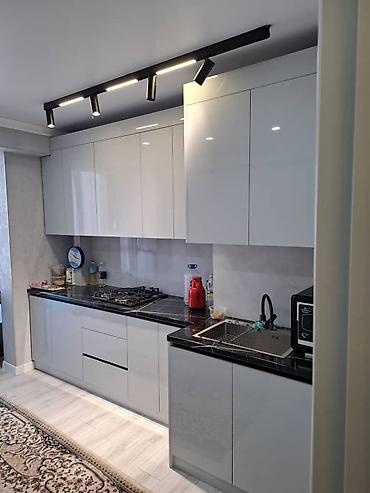 - Современная кухня в едином пространстве с гостиной: глянцевый кухонный гарнитур до потолка, черные каменные столешницы, варочная поверхность электроплита+газ, встроенная мойка, трековое и точечное освещение.