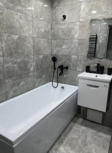 - Ванная комната: ванна стандартного размера, раковина с тумбой, зеркало, смесители и душевая лейка в матовом черном, стены и пол — керамогранит под мрамор, полотенцесушитель.