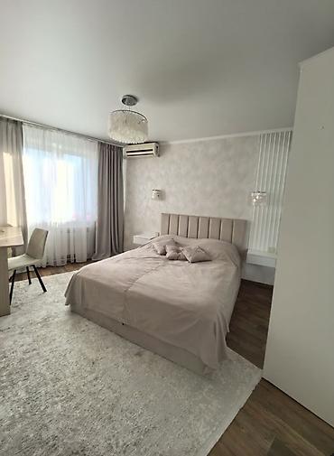 - Спальня: двуспальная кровать с мягким изголовьем, прикроватные консоли, декоративные бра, кондиционер, плотные шторы и тюль, большой ковер.