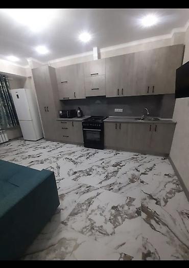 - Просторная кухня-гостиная с большим набором шкафов, рабочей столешницей и настенным телевизором.