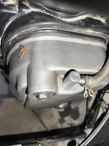 - Двигатель воздушного охлаждения с вариатором CVT. Кожух трансмиссии и кик‑стартер, электростартер. Видна сервисная магистраль/сапун картера.