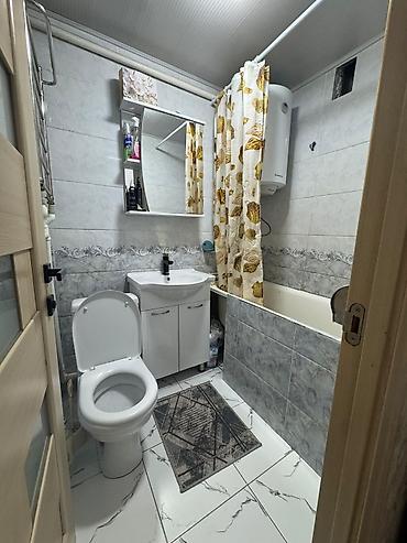 - Керамическая плитка на стенах и полу, душевая штора, полотенцесушитель