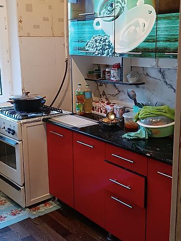 - Отдельная кухня с гарнитуром в глянцево‑красном исполнении, столешница под камень, открытые полки и навесные шкафы с фотопечатью. Газовая плита с духовкой, мойка, рабочая зона у окна.