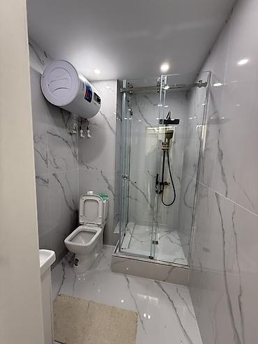- Санузел: облицовка крупноформатным керамогранитом «под мрамор», душевая кабина со стеклянными раздвижными дверями и верхним душем, унитаз, умывальник, электрический водонагреватель накопительный, точечная подсветка.