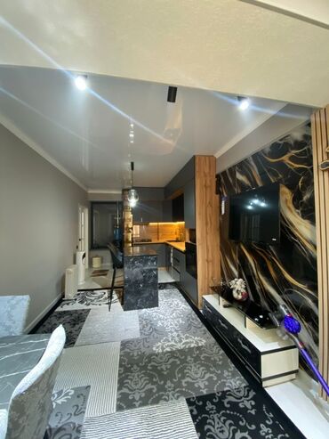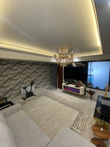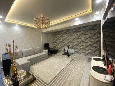 - Просторная гостиная с натяжным потолком и контурной подсветкой, хрустальной люстрой, акцентной 3D‑стеной и большим угловым диваном. На полу – светлый ковер, есть зона для отдыха и место под домашний тренажер. Встроенное точечное освещение по периметру.