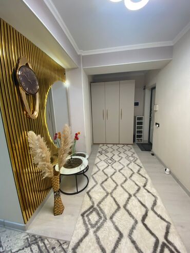- Просторная прихожая с декоративной панелью «золото», круглым зеркалом, настенными часами, консольным столиком и большим встроенным шкафом для хранения. Светлые полы, длинный дорожный ковер.