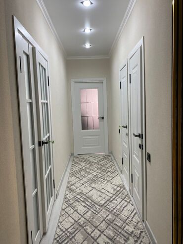 - Уютный светлый коридор с несколькими межкомнатными дверями с остеклением, качественные наличники, ровные стены в нейтральных тонах и потолочные споты.