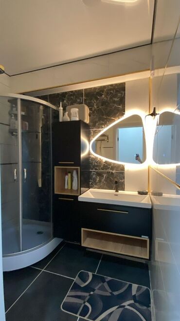 - Отдельная ванная комната в темно‑светлой гамме: душевой уголок с раздвижными стеклянными дверями, тумба с умывальником, высокие шкафы с нишами под хранение, крупноформатная плитка и дизайнерское зеркало с контурной подсветкой.