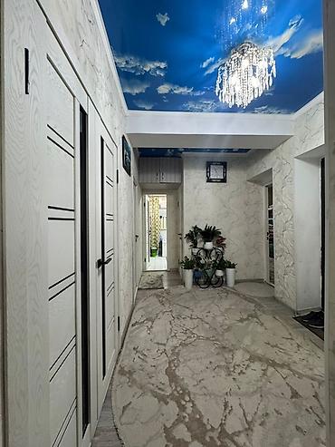 - Отделка: натяжные потолки — в коридоре с фотопечатью «небо с облаками» и хрустальной люстрой, на кухне — глянцевый фиолетовый. Стены с декоративной штукатуркой под мрамор. Пол — современное напольное покрытие в легких серых тонах, в коридоре ковровое покрытие.