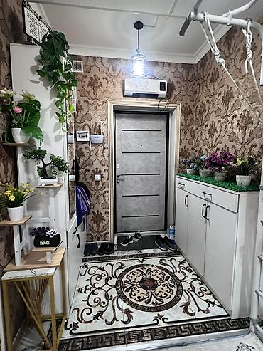 - Прихожая с вместительными шкафами, декоративными полками для цветов и зеркалом; напольная плитка с мозаичным узором.