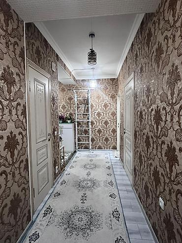 - Широкий коридор с несколькими комнатами по сторонам, декоративные светильники, стены оклеены фактурными обоями.
