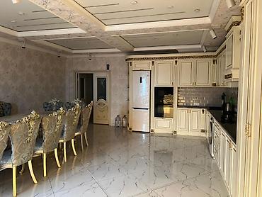 - Кухня: угловой гарнитур в классическом стиле с резными фасадами и золотистой фурнитурой, встроенная техника, духовой шкаф, варочная панель, вытяжка, посудомоечная машина, стиральная машина, холодильник, фартук «кабанчик», широкая рабочая поверхность. Большой обеденный стол с комплектом стульев в едином стиле.