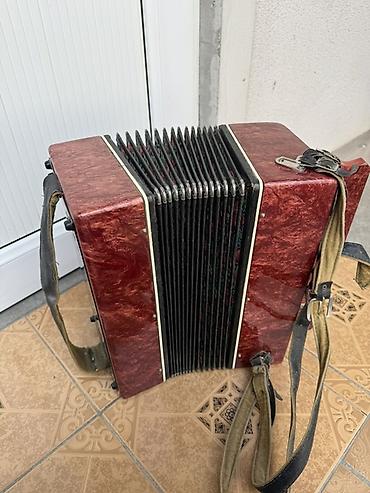 Аккордеон (гармоника) с ремнями - Корпус из красного перламутрового пластика с красивой древесной текстурой. - Меха с защитными металлическими углами. - Две кожаные плечевые лямки с пряжками, регу...