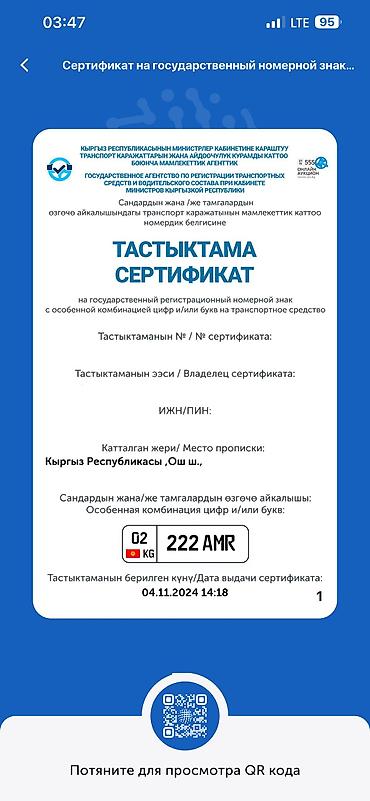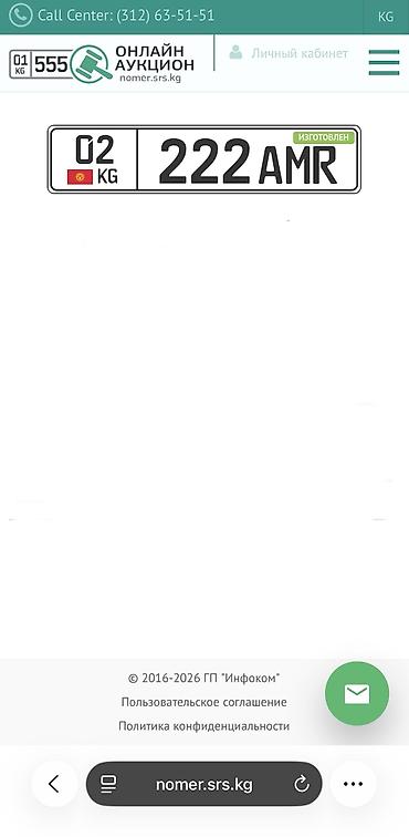 Продаю Госномер с региональным кодом «08» (Чуйская область) и серией «989 AAK». Цена 11000 сомов. Миниторг уместен. Сертификат имеется.