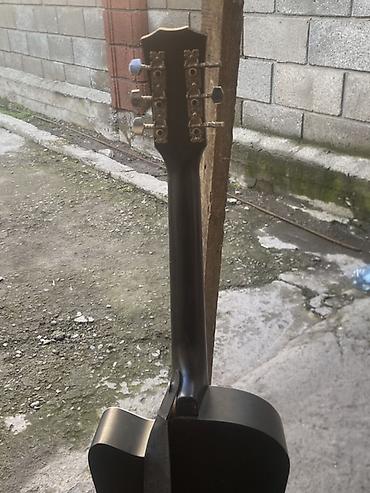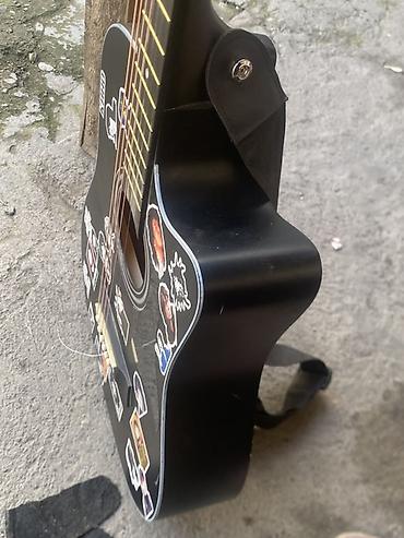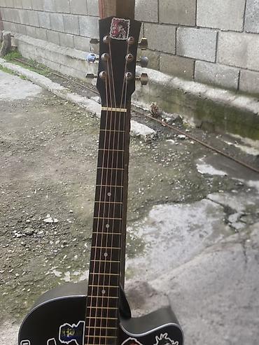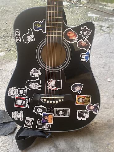 Акустическая гитара 6-струнная, корпус дредноут с вырезом (cutaway), цвет — черный матовый. Украшена наклейками в рок‑стилистике.