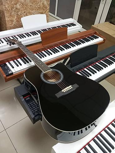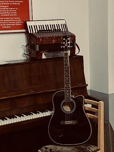 Акустическая гитара, форма корпуса Dreadnought (вариант с вырезом для удобного доступа к верхним ладам). Цвет – черный глянец с белым кантом.