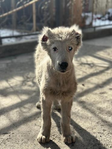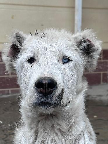 Щенок хаски/лайка (предположительно метис) с редкими глазами разного цвета (один голубой, второй тёмный).