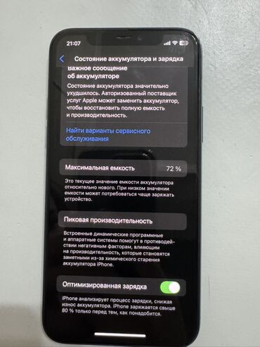 - Аккумулятор: максимальная ёмкость 72% (в разделе “Состояние аккумулятора” отображается сообщение о необходимости обслуживания)