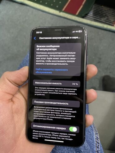 - Аккумулятор: максимальная ёмкость по системе 74% (на экране настроек отображается предупреждение о снижении ёмкости; доступна рекомендация на замену для восстановления полной производительности)