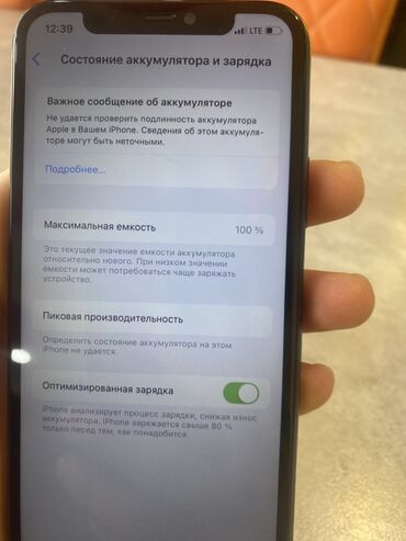 - Аккумулятор: в разделе «Состояние аккумулятора и зарядка» отображается максимальная ёмкость 100%; активирована «Оптимизированная зарядка». Присутствует системное уведомление «Не удается проверить подлинность аккумулятора Apple…».