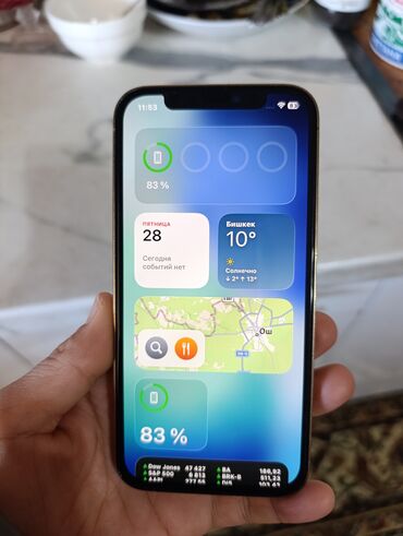 - На экране виджеты iOS: погода, карты, виджеты батареи; отображается заряд 83%