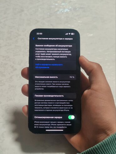 - На экране «Состояние аккумулятора» отображается максимальная ёмкость 74% и уведомление о необходимости сервисной замены — актуально тем, кто планирует менять батарею.