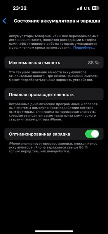 - Аккумулятор: максимальная ёмкость 88%, пиковая производительность нормальная, включена оптимизированная зарядка