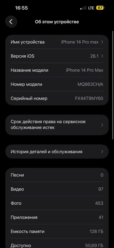 IPhone 14 Pro Max 128 ГБ, цвет Deep Purple. Характеристики и детали: - Модель: iPhone 14 Pro Max (номер модели MQ9T3ZD/A). - Память: 128 ГБ, доступно 108,37 ГБ. - iOS: версия 16.1 (на фото указана...
