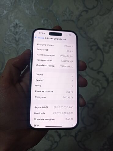 IPhone 14 Pro Max, 256 ГБ, цвет Deep Purple Характеристики и детали: - Модель: iPhone 14 Pro Max (Model Number: MQ8A3ZA/A) - Объем памяти: 256 GB (доступно ~242 GB на фото экрана) - Разблокировка:...